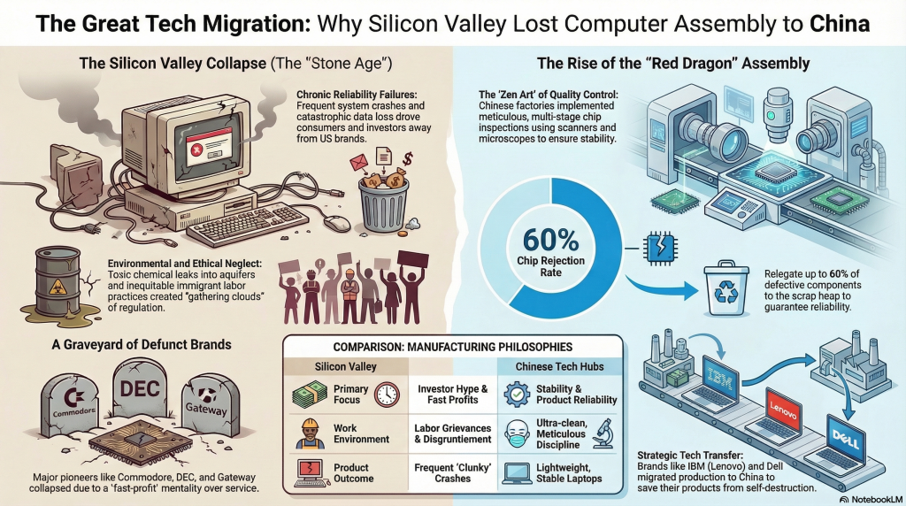 Intro – In a friendly but realistically skeptical response to President Donald Trump’s suggestion of reviving America’s once-dominant role in computer production – back in its Stone Age – here is a long look back at the self-inflicted decline and fall of Silicon Valley followed by China’s cautious rise to dominance over tech manufacturing and export of those devices worldwide.